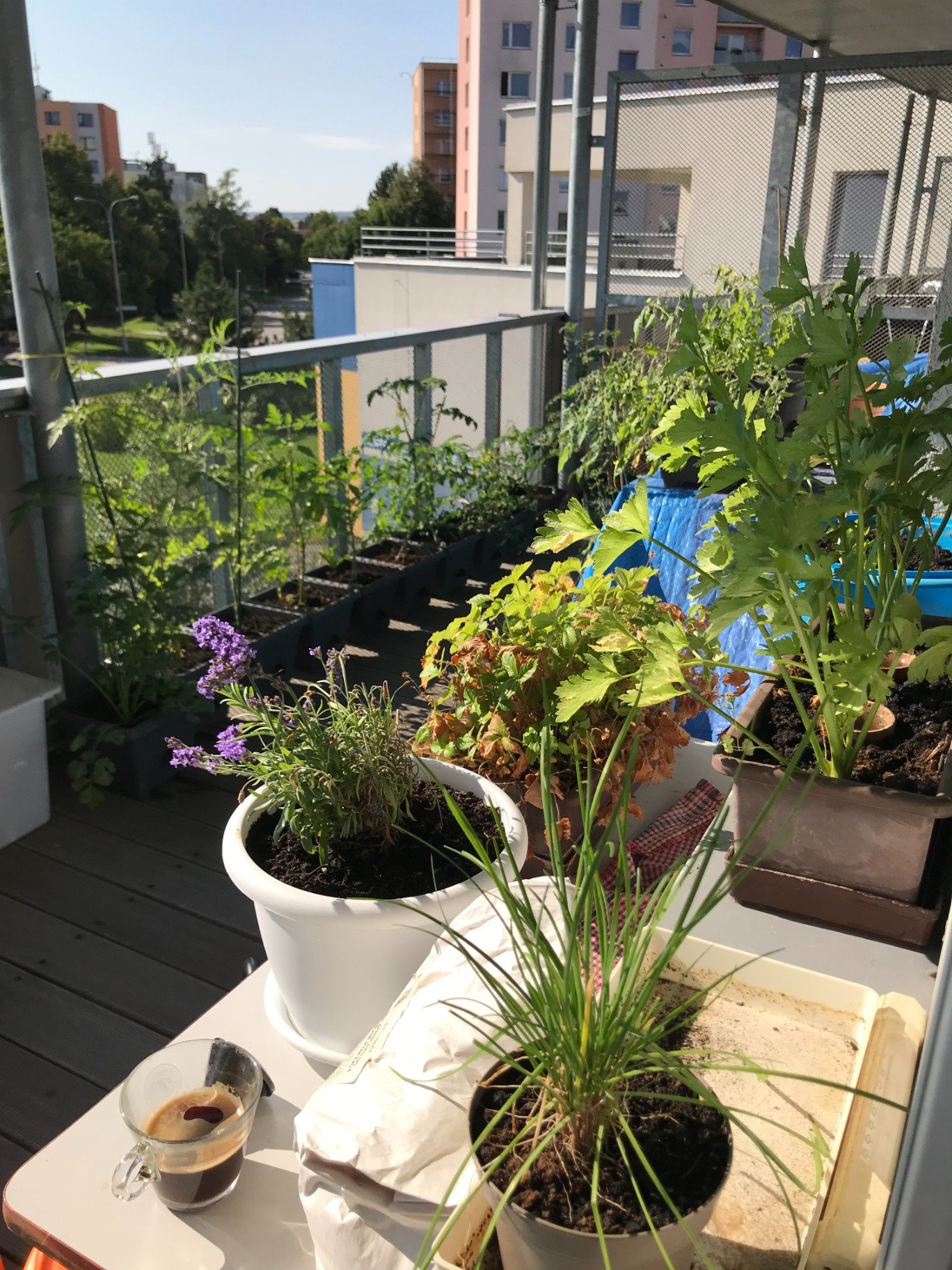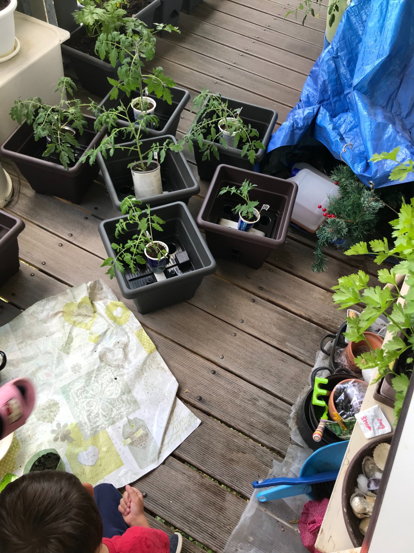 Zahrádka na balkóně je v plném rozpuku, dozrávají rajčata i jahody. Nově zasazený pozdní hrášek se začal klubat z hlíny. Děti každý den uždibují nově dozrálá rajčata nebo jahody a hlavně se podílí na pravidelném zalévání.