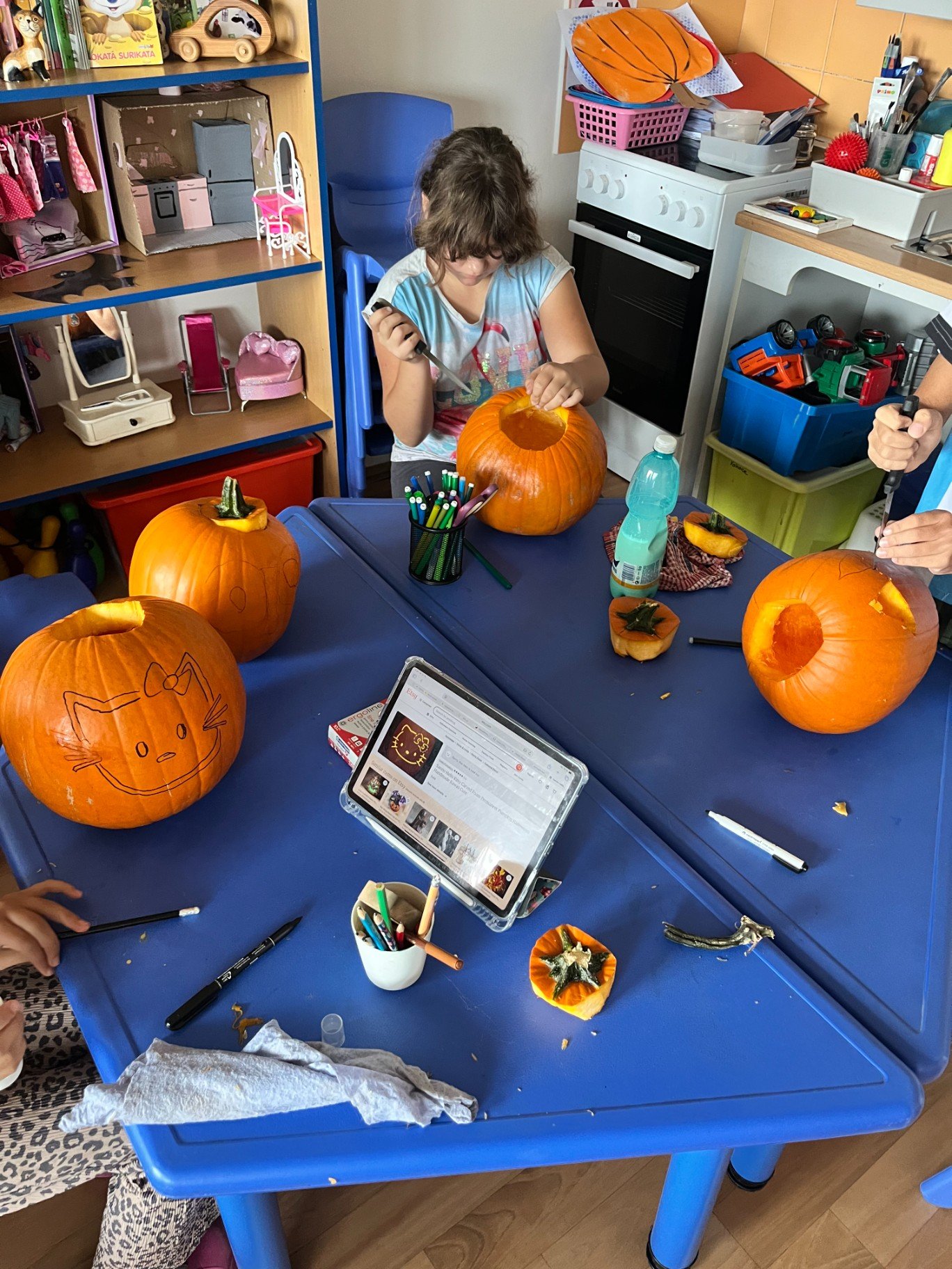 V říjnu jsme stihli ještě dlabání dýní jako každý rok v tomto období nejžádanější aktivita. Jen pro maminky bylo zase podzimní tvoření věnečků. A v úterý 14. 10. 2025 se uskutečnila Canisterapie, což je aktivita kterou mají rády nejen děti, ale i jejich maminky.