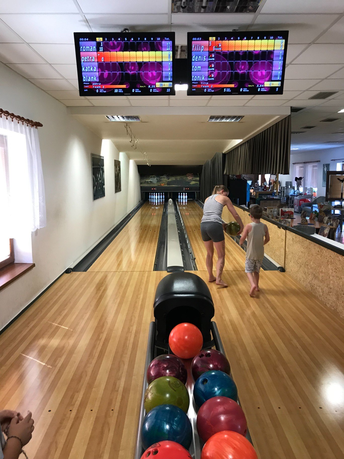 Ve druhém srpnovém týdnu jsme dokonce stihli navštívit koupaliště dvě a zpestřili si koupání i návštěvou bowlingu. Tentokrát jsme zkusili Bowling v Chocni, který je hned vedle koupaliště.